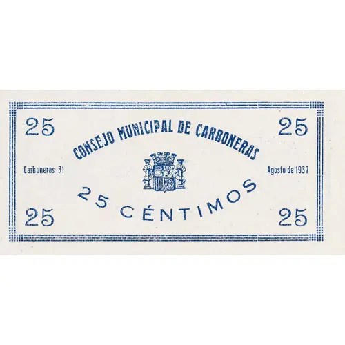 25 CONSEJO MUNICIPAL DE CARBONERAS 25 CÉNTIMOS Carboneras, 31 Agosto de 1937 (Translation: Municipal Council of Carboneras 25 Centimos Carboneras August 31, 1937.) |