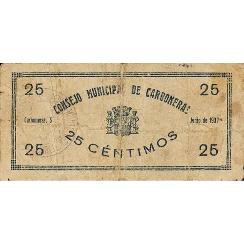 25 CONSEJO MUNICIPAL DE CARBONERAS 25 CÉNTIMOS Carboneras, 5 Junio de 1937 (Translation: Municipal Council of Carboneras 25 Centimos Carboneras June 5, 1937.) |