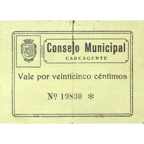 Consejo Municipal CARCAGENTE Vale por veinticinco céntimos (Translation: Municipal Council Carcagente Valid for Twenty-five Centimos) |