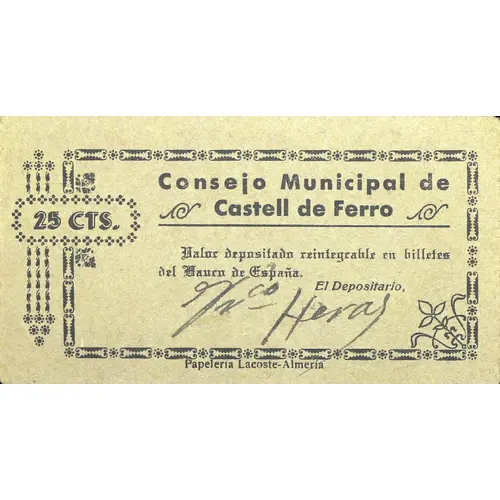 25 CTS. Consejo Municipal de Castell de Ferro Valor depositado reintegrable en billetes del Banco de España. (Translation: 25 Centimos Municipal Council of Castell de Ferro Deposited value refundable in banknotes of the Bank of Spain.) |