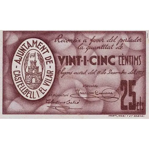 Obverse lettering AJUNTAMENT DE CASTELLBELL I EL VILAR Reconeix a favor del portador VINT-I-CINC CÈNTIMS Segons acord del 11 de Desembre del 1937.