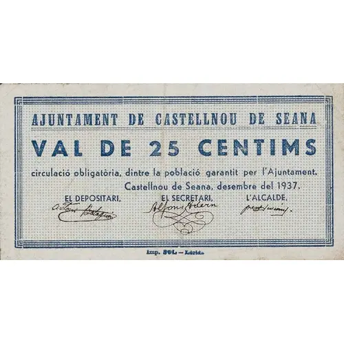 AJUNTAMENT DE CASTELLNOU DE SEANA VAL DE 25 CENTIMS circulació obligatòria, dintre la població garantit per l`Ajuntament. Castellnou de Seana, desembre del 1937. (Translation: City Council of Castellnou de Seana Voucher for 25 Centimos mandatory circulation, within the population guaranteed by the City Council. Castellnou de Seana, December 1937.) |
