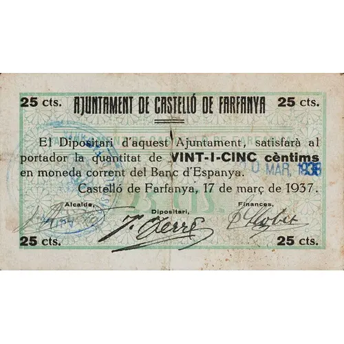 25 cts. AJUNTAMENT DE CASTELLÓ DE FARFANYA El Dipositari d`aquest Ajuntament, satisfarà el portador la quantitat de VINT-I-CINC cèntims en moneda corrent del Banc d`Espanya. Castelló de Farfanya, 17 de març de 1937. (Translation: 25 Centimos City council of Castelló de Farfanya The Depositary of this City Council, will satisfy the bearer the amount of Twenty-five Centimos in current currency of the Bank of Spain. Castellón de Farfanya, 17 March 1937.) |