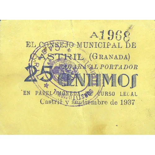 EL CONSEJO MUNICIPAL DE CASTRIL (GRANADA) PAGARA AL PORTADOR 25 CENTIMOS EN PAPEL MONEDA DE CURSO LEGAL Castril y septiembre de 1937 (Translation: The Municipal Council of Castril (Granada) Will pay the bearer 25 Centimos In legal tender paper money Castril, September 1937) |