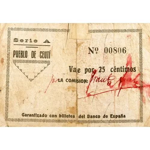 PUEBLO DE CEUTÍ Vale por 25 céntimos Garantizado con billetes del Banco de España (Translation: Town of Ceutí Voucher for 25 Centimos Guaranteed with banknotes from the Bank of Spain) |
