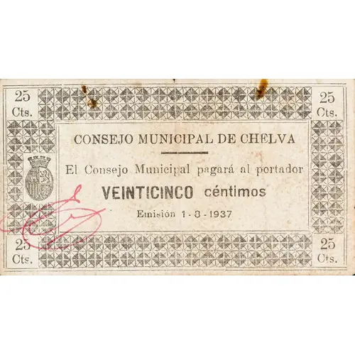 25 Cts CONSEJO MUNICIPAL DE CHELVA El Consejo Municipal pagará al portador VEINTICINCO céntimos Emisión 1-8-1937 (Translation: 25 Centimos Municipal Council of Chelva The Municipal Council will pay the bearer Twenty-five Centimos Issue August 1, 1937) |