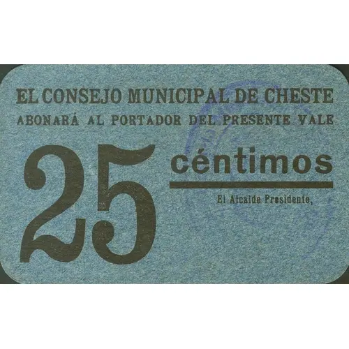 EL CONSEJO MUNICIPAL DE CHESTE ABONARÁ AL PORTADOR DEL PRESENTE VALE 25 céntimos (Translation: The Municipal Council of Cheste Will pay to the bearer of this voucher 25 Centimos) |