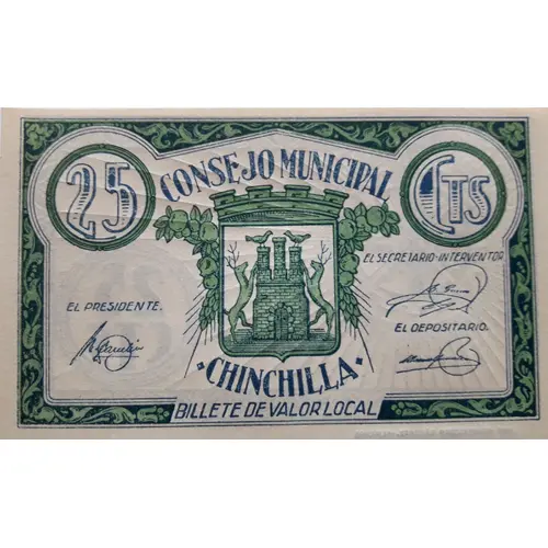 25 CTS CONSEJO MUNICIPAL · CHINCHILLA · BILLETE DE VALOR LOCAL (Translation: 25 Centimos Municipal Council · Chinchilla · Local value banknote) |