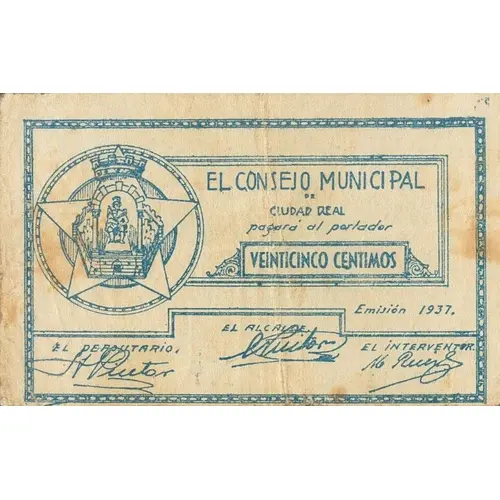 (Translation: The Municipal Council of Ciudad Real will pay the bearer Twenty-five Centimos Issue 1937.)