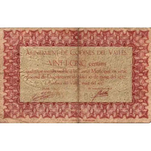 AJUNTAMENT DE CODINES DEL VALLÈS VINT-I-CINC cèntims quantitat reemborsable a la Caixa Municipal, en virtut d`acord de l`Ajuntament de data 10 de maig del 1937. Codines del Vallès, maig del 1937 (Translation: City Council of Codines del Vallès Twenty-five Centimos amount reimbursable to the `Caixa Municipal`, by agreement of the City Council dated May 10, 1937. Codines del Vallès, May 1937) |