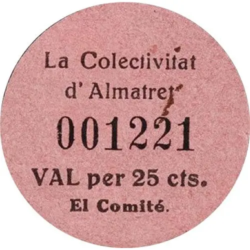 La Colectivitat d`Almatret 001221 VAL per 25 cts. El Comité. (Translation: The Collectivity of Almatret Voucher for 25 Centimos. The Committee.) |