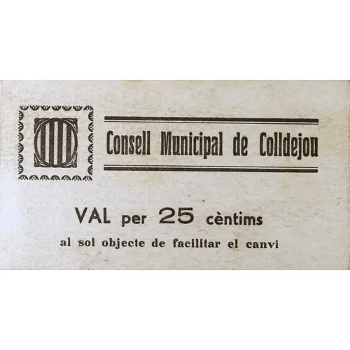 Consell Municipal de Colldejou VAL per 25 cèntims al sol objecte de facilitar el canvi (Translation: Municipal Council of Colldejou Voucher for 25 Centimos for the sole purpose of facilitating change) |