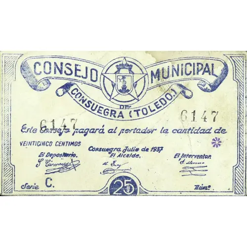CONSEJO MUNICIPAL DE CONSUEGRA (TOLEDO) Este Consejo pagará al portador la cantidad de VEINTICINCO CENTIMOS Consuegra Julio de 1937 (Translation: Municipal Council of Consuegra (Toledo) This Council will pay the bearer the amount of Twenty-five Centimos Consuegra July, 1937) |