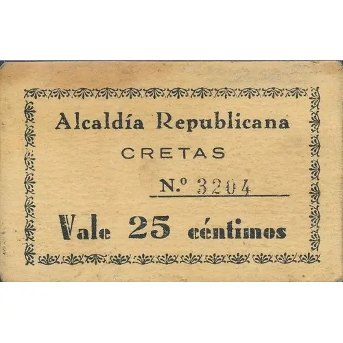 Alcaldía Republicana CRETAS Vale 25 céntimos (Translation: Republican Mayoralty Cretas Voucher 25 Centimos) |