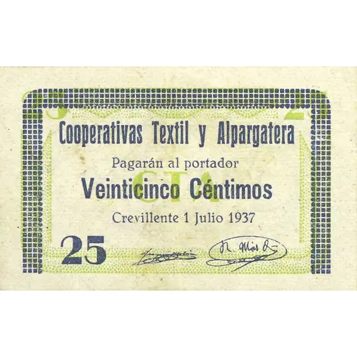 Cooperativas Textil y Alpargatera pagarán al portador Veinticinco Céntimos Crevillente 1 Julio 1937 25 (Translation: Textile and Espadrille Cooperatives will pay the bearer Twenty-five Centimos Crevillente, July 1, 1937) |