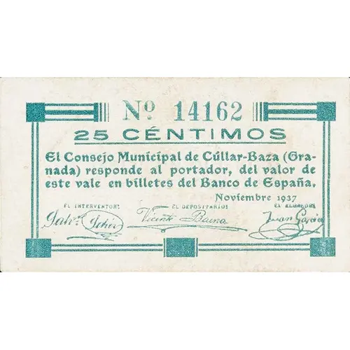 25 CÉNTIMOS El Consejo Municipal de Cullar-Baza (Granada) responde al portador, del valor de este vale en billetes del Banco de España. Noviembre 1937 (Translation: 25 Centimos The Municipal Council of Cullar-Baza (Granada) is responsible to the bearer for the value of this voucher in Bank of Spain notes. November 1937) |