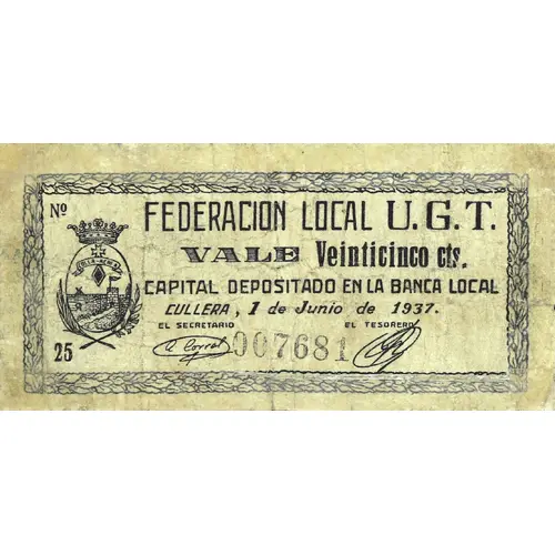 Obverse lettering FEDERACIÓN LOCAL U. G. T. VALE Veinticinco cts. CAPITAL DEPOSITADO EN LA BANCA LOCAL CULLERA, 1 de Junio de 1937.