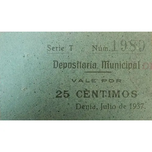 Depositaría Municipal VALE POR 25 CÈNTIMOS Denia, Julio de 1937. (Translation: Municipal Depository Voucher for 25 Centimos Dénia July, 1937.) |