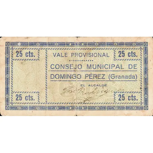 25 cts. VALE PROVISIONAL CONSEJO MUNICIPAL DE DOMINGO PÉREZ (Granada) (Translation: 25 Centimos Provisional voucher Municipal Council of Domingo Pérez (Granada)) |