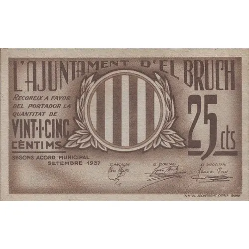 L`AJUNTAMENT D`EL BRUCH RECONEIX A FAVOR DEL PORTADOR LA QUANTITAT DE VINT-I-CINC CÈNTIMS / 25 cts SEGONS ACORD MUNICIPAL SETEMBRE 1937 (Translation: The City Council of El Bruch Recognizes in favour of the bearer the amount of Twenty Five Centimos / 25 Centimos According to Municipal agreement September 1937) |