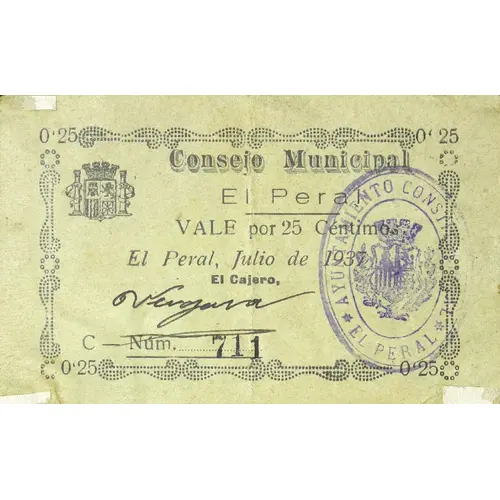 0`25 Consejo Municipal El Peral VALE por 25 Céntimos El Peral, Julio de 1937 (Translation: Municipal Council of El Peral Voucher for 25 Centimos El Peral, July of 1937) |