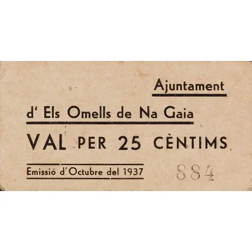 Ajuntament d`Els Omells de Na Gaia VAL PER 25 CÈNTIMS Emissió d`Octubre del 1937 (Translation: City Council of Els Omells de Na Gaia Voucher for 25 Centimos Issue of October 1937) |