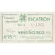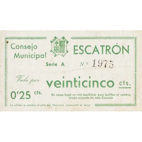 Obverse lettering Consejo Municipal ESCATRÓN Vale por 0`25 cts. veinticinco cts. De curso legal en esta localidad, para facilitar el cambio, según acuerdo de este Consejo La validez la acredita el sello del Municipio estampado al dorso