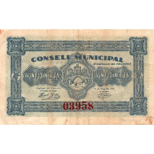 25 CENTIMS CONSELL MUNICIPAL VINT-I-CINC CENTIMS ESPLUGA DE FRANCOLÍ BITLLET DE CIRCULACIÓ OBLIGATORIA A TOTA LA JURISDICCIÓ MUNICIPAL (Translation: 25 Centimos Municipal Council Twenty five Centimos Espluga de Francolí Mandatory circulation banknote for all Municipal jurisdiction) |
