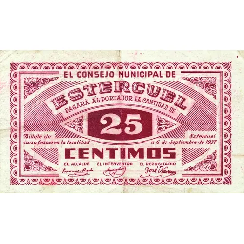 EL CONSEJO MUNICIPAL DE ESTERCUEL PAGARÁ AL PORTADOR LA CANTIDAD DE 25 CENTIMOS Billete de curso forzoso en la localidad Estercuel a 6 de Septiembre de 1937 (Translation: The Municipal Council of Estercuel Will pay the bearer the amount of 25 Centimos Mandatory course banknote in the municipality Estercuel, September 6, 1937) |