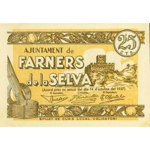 25 CTS. AJUNTAMENT de FARNERS de la SELVA (Acord pres en sessió del dia 14 d`octubre del 1937) BITTLET DE CIRS LOCAL OBLIGATORI (Translation: 25 Centimos City Council of Farners de la Selva (Agreement reached in session on October 14, 1937) Mandatory local course banknote) |