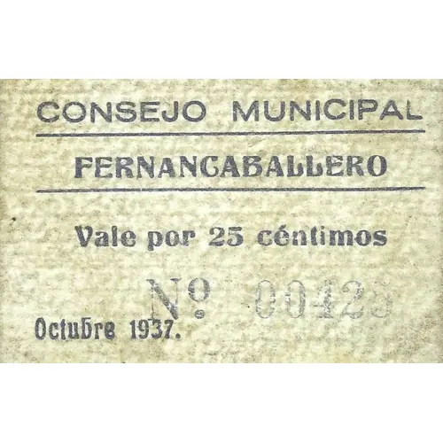 CONSEJO MUNICIPAL FERNANCABALLERO Vale por 25 céntimos Octubre 1937. (Translation: Municipal Council Fernancaballero Voucher for 25 Centimos October 1937.) |