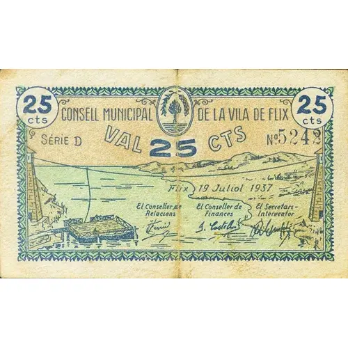 25 cts CONSELL MUNICIPAL DE LA VILA DE FLIX VAL 25 CTS Flix 19 Juliol 1937 (Translation: 25 Centimos Municipal Council of the town of Flix Voucher 25 Centimos Flix, July 19, 1937) |
