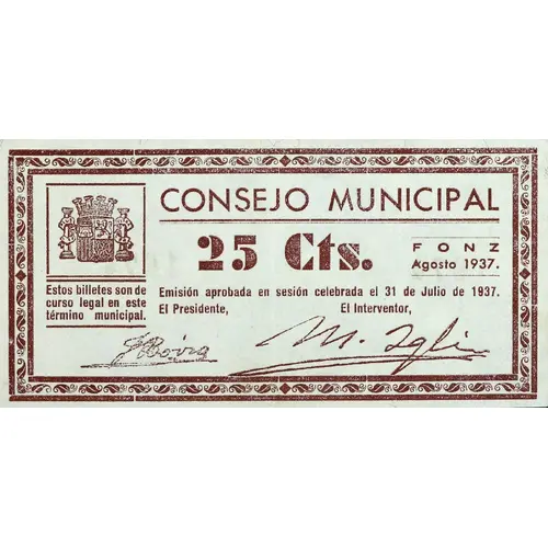 CONSEJO MUNICIPAL 25 Cts. FONZ Agosto 1937. Estos billetes son de curso legal en este término municipal. Emisión aprobada en sesión celebrada el 31 de Julio de 1937. (Translation: Municipal Council 25 Centimos Fonz August 1937. These banknotes are legal tender in this municipality. Issue approved in session held on July 31, 1937.) |