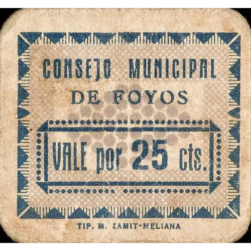 CONSEJO MUNICIPAL DE FOYOS VALE por 25 cts. TIP. M. ZAMIT - MELIANA (Translation: Municipal Council of Foyos Voucher for 25 Centimos) |