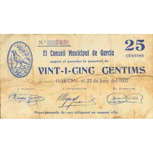 25 CÈNTIMS El Consell Municipal de Garcia pagarà al portador la quantitat de VINT-I-CINC CENTIMS GARCIA, el 22 de Juny del 1937 Paper-moneda de curs obligatori en aquesta vila (Translation: 25 Centimos The Municipal Council of Garcia will pay the bearer the amount of Twenty five Centimos Garcia, June 22, 1937 Mandatory course paper-money in this town) |
