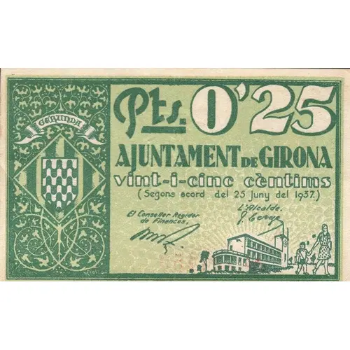 Pts. 0`25 AJUNTAMENT DE GIRONA vint-i-cinc cèntims (Segons acord del 25 Juny del 1937.) (Translation: Pesetas 0.25 City Council of Girona Twenty five Centimos (By agreement of June 25, 1937.)) |