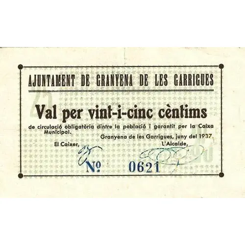 AJUNTAMENT DE GRANYENA DE LES GARRIGUES Val per vint-i-cinc cèntims de circulació obligatòria dintre la població i garantit per la Caixa Municipal. Granyena de les Garrigues, juny del 1937. (Translation: City Council of Granyena de les Garrigues Valid for Twenty-five Centimos of mandatory circulation within the city and guaranteed by the Municipal Treasury. Granyena de les Garrigues, June 1937.) |