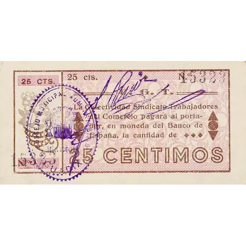 25 CTS. U. G. T. La Colectividad Sindicato de Trabajadores del Comercio pagará al portador, en moneda del Banco de España, la cantidad de 25 CENTIMOS (Translation: 25 Centimos U. G. T. The Commercial Workers Union Collective will pay the bearer, in currency of the Bank of Spain, the amount of 25 Centimos) |
