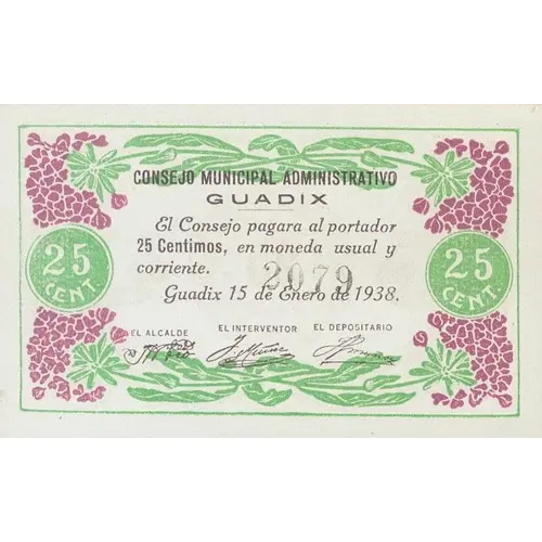 | Obverse lettering | 25 CENT. CONSEJO MUNICIPAL ADMINISTRATIVO GUADIX El Consejo pagara al portador 25 Centimos, en moneda usual y corriente. Guadix 15 de Enero de 1938. (Translation: 25 Centimos Municipal Administrative Council Guadix The Council will pay the bearer 25 Centimos, in usual and current currency. Guadix January 15, 1938.) |