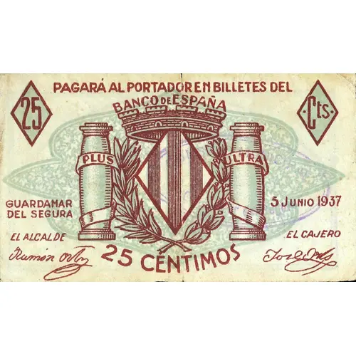| Obverse lettering | PAGARÁ AL PORTADOR EN BILLETES DEL BANCO DE ESPAÑA 25 Cts GUARDAMAR DEL SEGURA - 5 JUNIO 1937 25 CÉNTIMOS (Translation: Will pay the bearer in banknotes of the Bank of Spain 25 Centimos Guardamar del Segura - June 5, 1937 25 Centimos) |