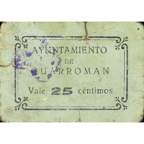 AYUNTAMIENTO DE GUARROMAN Vale 25 céntimos (Translation: City Council of Guarromán It is worth 25 Centimos) |