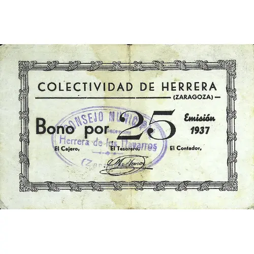 COLECTIVIDAD DE HERRERA (ZARAGOZA) Bono por 25 Emisión 1937 (Translation: Collectivity of Herrera (Zaragoza) Bond for 25 Issue 1937) |