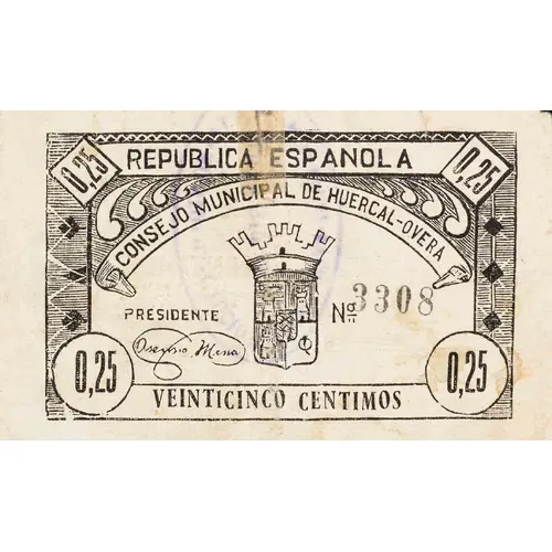 0,25 REPUBLICA ESPANOLA CONSEJO MUNICIPAL DE HUERCAL-OVERA VEINTICINCO CENTIMOS (Translation: Spanish Republic Municipal Council of Huércal-Overa Twenty-five Centimos) |