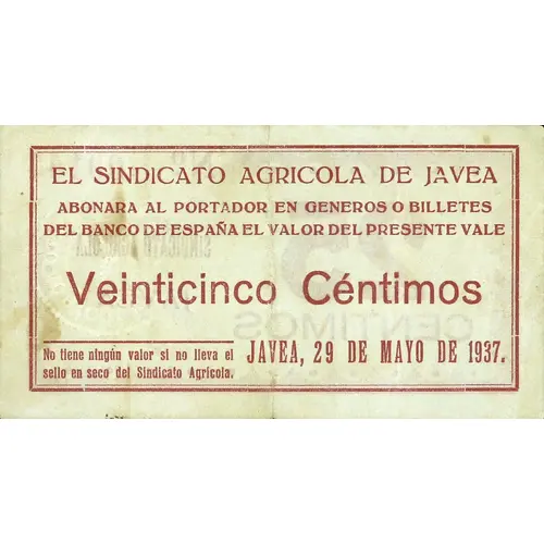 (Translation: The Agricultural Union of Javea Will pay the bearer in goods or banknotes from the Bank of Spain the value of this voucher. Twenty Five Centimos It has no value if it does not bear the dry seal of the Agricultural Union Javea, May 29, 1937.)