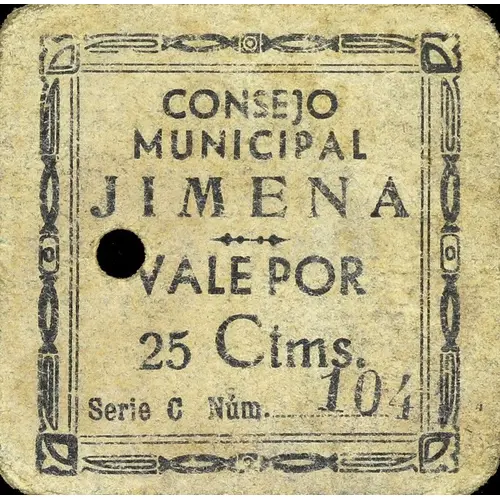 CONSEJO MUNICIPAL JIMENA VALE POR 25 Ctms. (Translation: Municipal Council Jimena Valid for 25 Centimos) |