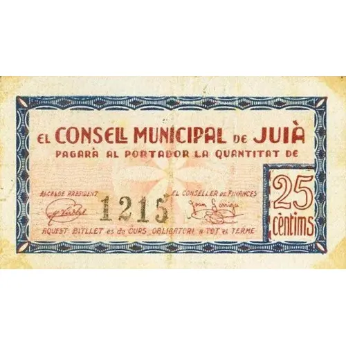 EL CONSELL MUNICIPAL DE JUIÀ PAGARÀ AL PORTADOR LA QUANTITAT DE 25 cèntims AQUEST BITLLET es de CURS OBLIGATORI A TOT el TERME (Translation: The Municipal Council of Juià Will pay the bearer the amount of 25 Centimos This ticket is a mandatory course throughout the term) |