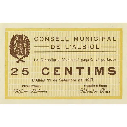 CONSELL MUNICIPAL DE L`ALBIOL La dipositaria Municipal pagarà al portador 25 CENTIMS L`Albiol 11 de Setembre del 1937. (Translation: Municipal Council of L`Albiol The Municipal Depositary will pay the bearer 25 Centimos L`Albiol, September 11, 1937.) |