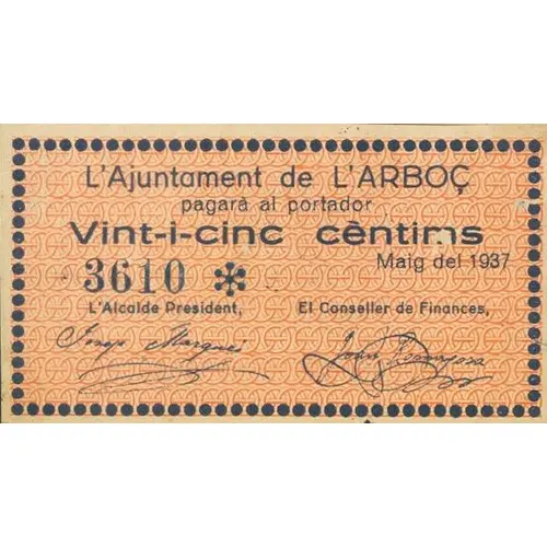 L`Ajuntament de L`ARBOÇ pagarà al portador Vint-i-cinc cèntims Maig del 1937 (Translation: The City Council of l`Arboç will pay the bearer Twenty five Centimos May 1937) |
