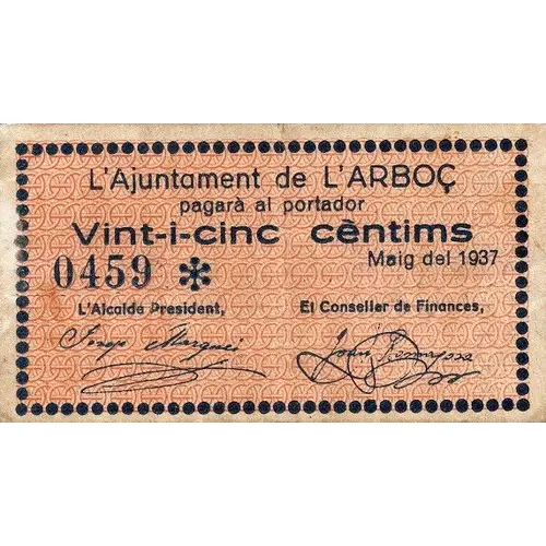 L`Ajuntament de L`ARBOÇ pagarà al portador Vint-i-cinc cèntims Maig del 1937 (Translation: The City Council of l`Arboç will pay the bearer Twenty five Centimos May 1937) |