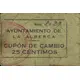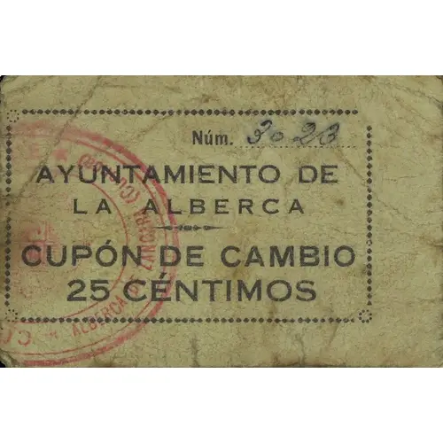 AYUNTAMIENTO DE LA ALBERCA CUPÓN DE CAMBIO 25 CÉNTIMOS (Translation: City Council of La Alberca Exchange coupon 25 Centimos) |